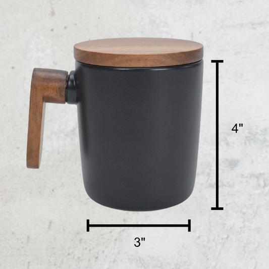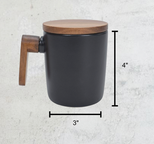 Custom Engraved Black Stoneware Mug – 12oz Japanese-Style Coffee Cup with Wood Handle & Lid